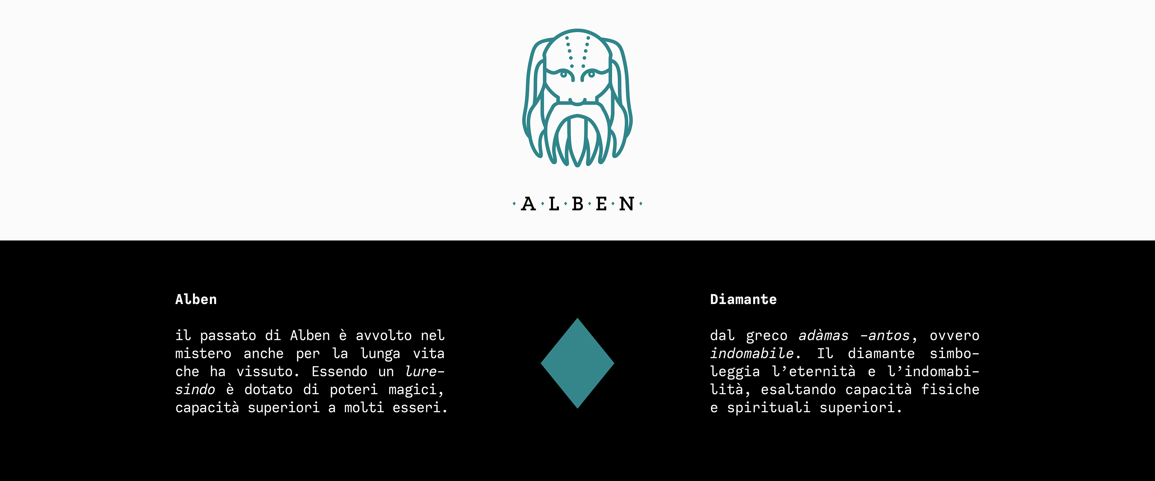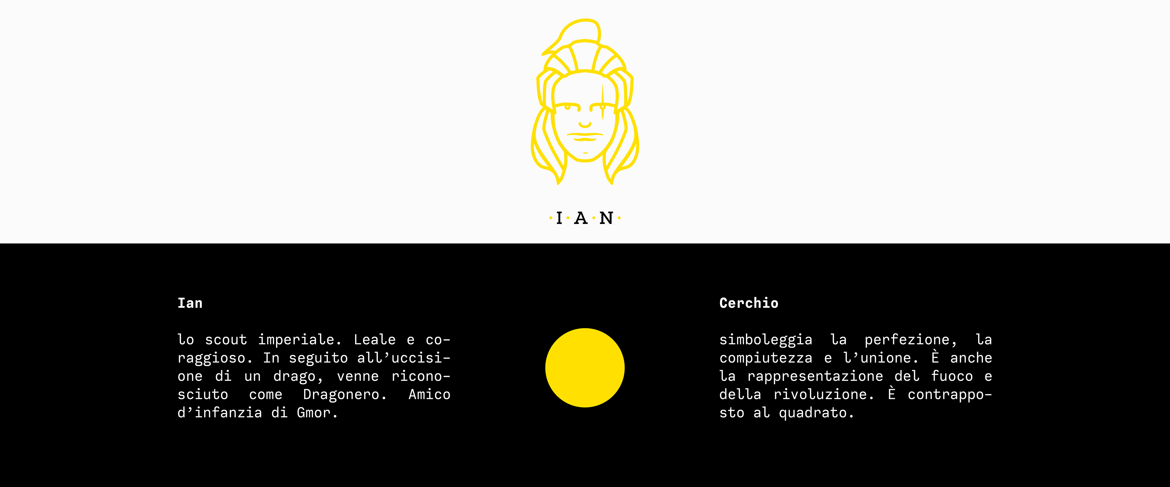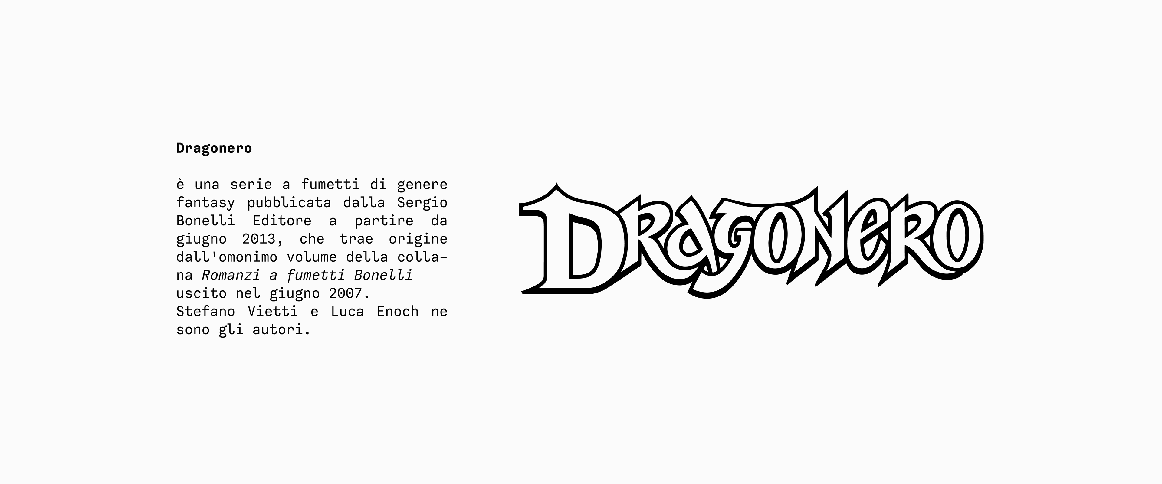 Progettazione grafica di pittogrammi dei personaggi della serie a fumetti Dragonero, della casa editrice Sergio Bonelli Editore. Attraverso lo studio dei personaggi principali del fumetto, si è cercato di geometrizzare i volti in modo tale da realizzare una versione sintetica e geometricamente proporzionata di un pittogramma per ogni singolo personaggio ad esso legato. Il lavoro è stato caratterizzato da una fase iniziale di schizzi per estrapolare le linee principali dei volti. Successivamente, tramite la sezione aurea, si è portata avanti la geometrizzazione dei volti, mantenendo proporzioni e ordine tra i vari elementi grafici. Una volta completata la fase di disegno, si è portata avanti la fase di studio per il colore, assegnando un colore principale ad ogni singolo personaggio. Tramite la selezione di campioni di colori nella palette Pantone, sono stati scelti anche i colori che hanno portato alla realizzazione finale e completa dei pittogrammi. In seguito alla colorazione si è studiato un logotipo per ogni personaggio, caratterizzato dal proprio nome e dal proprio nome e da una forma geometrica che lo rappresenta per qualità e caratteristiche simboliche. La fase di studio si è poi spostata verso l'applicare dei pittogrammi ad elementi di uso quotidiano, ovvero realizzando di gadgets a tema.